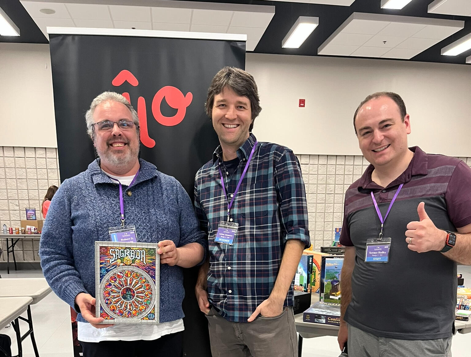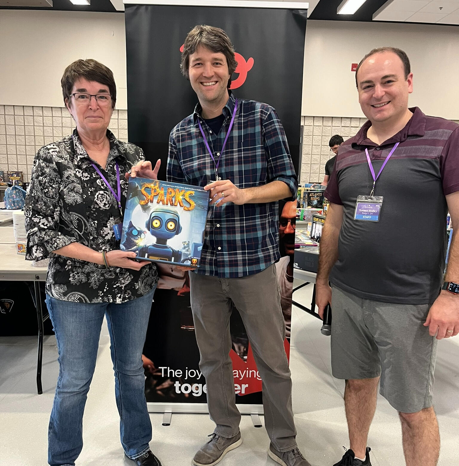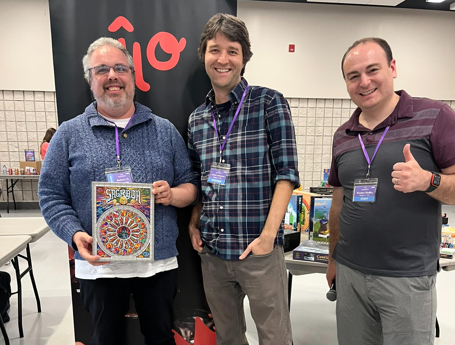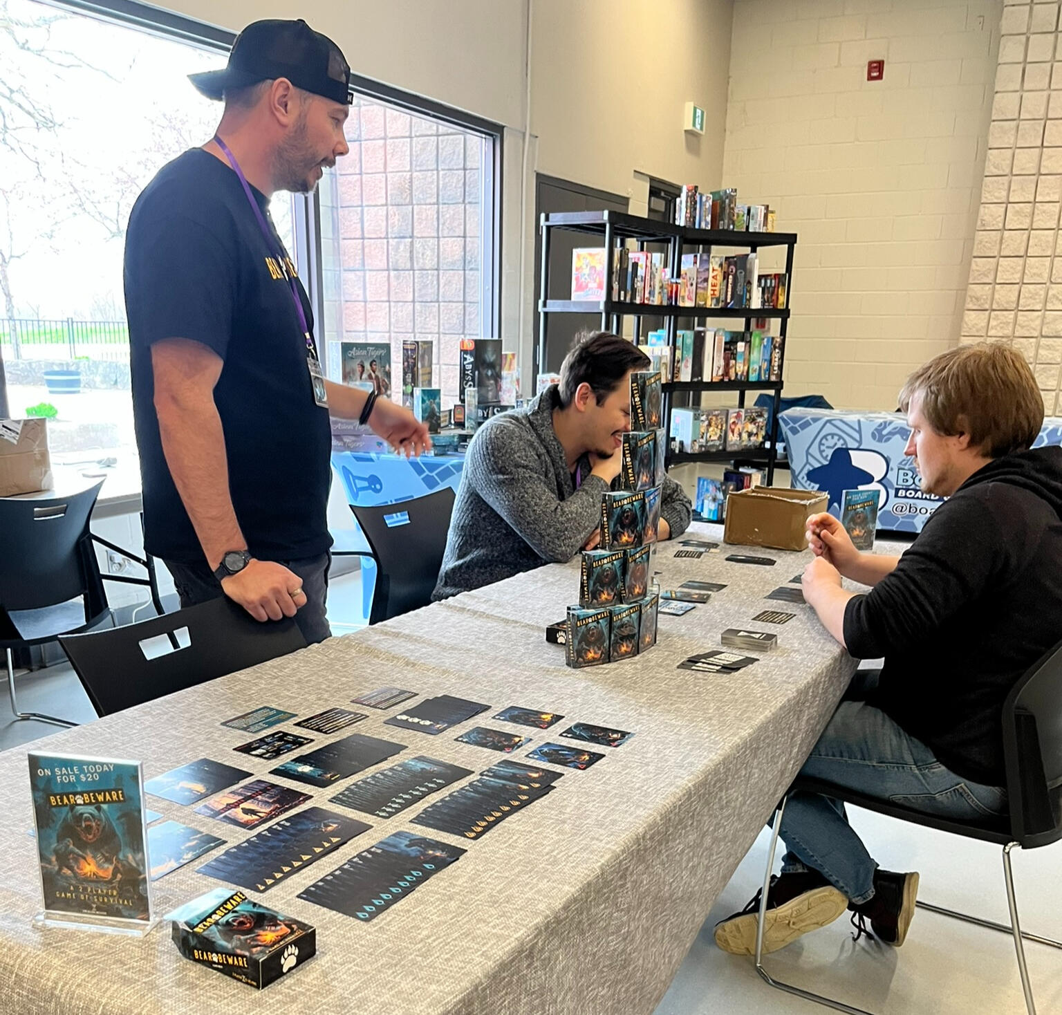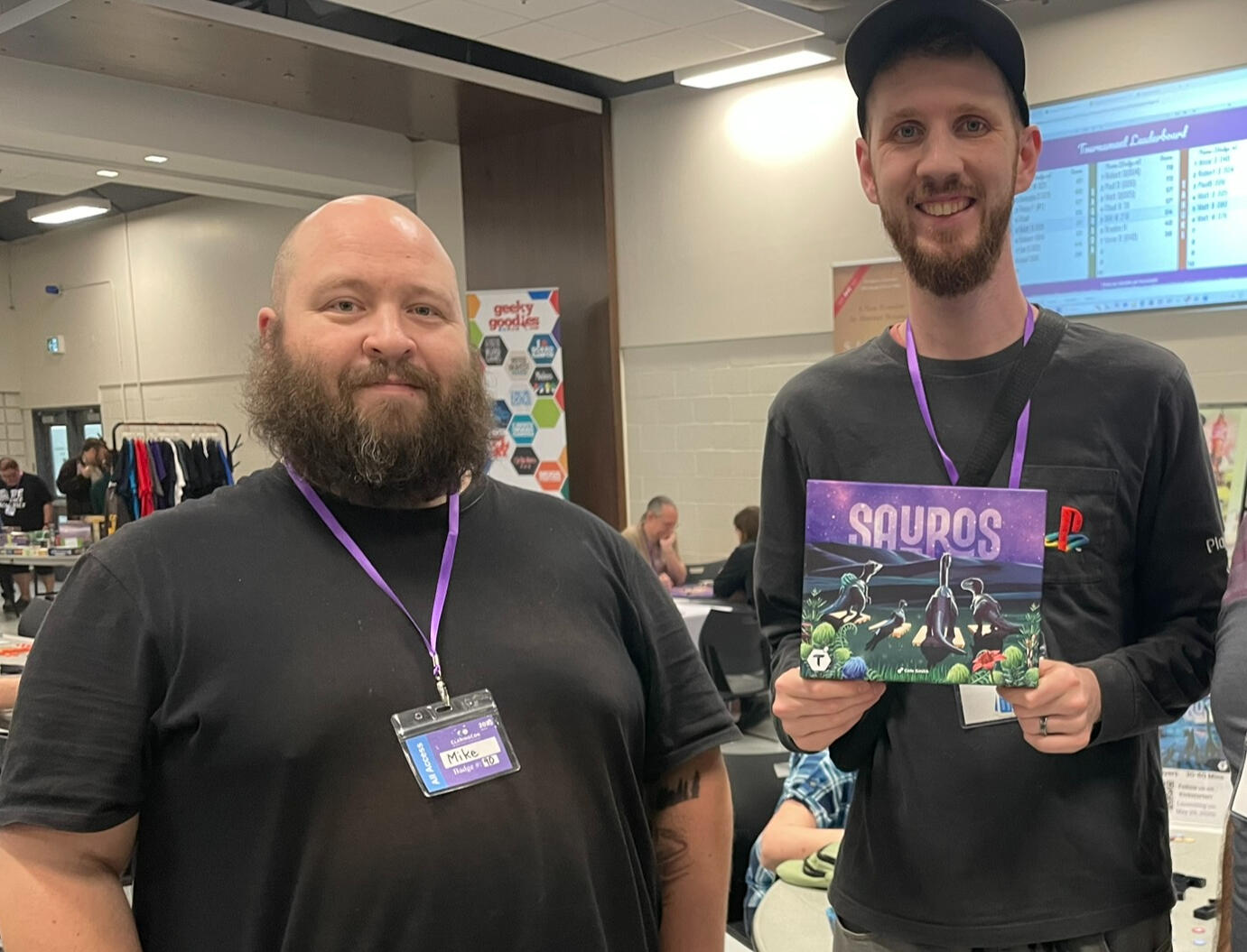 We strive to have Special Guests Attend ClaringCon each year. In 2025 we had board game designer Cole Smith debut his new game, Sauros along with award winning board game designer of Sagrada Adrian Adamescu join us at ClaringCon.