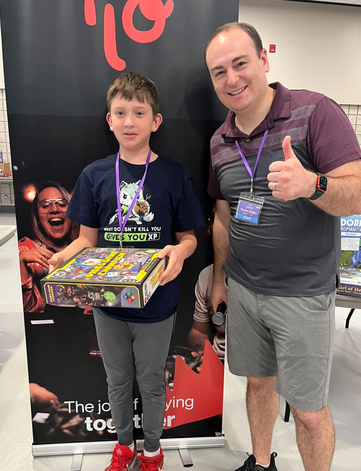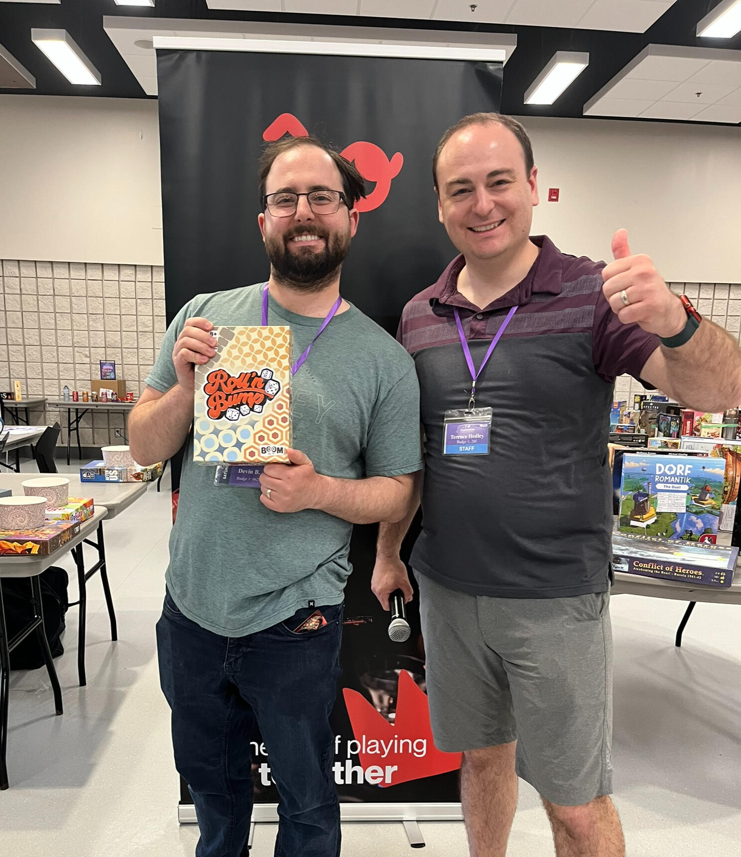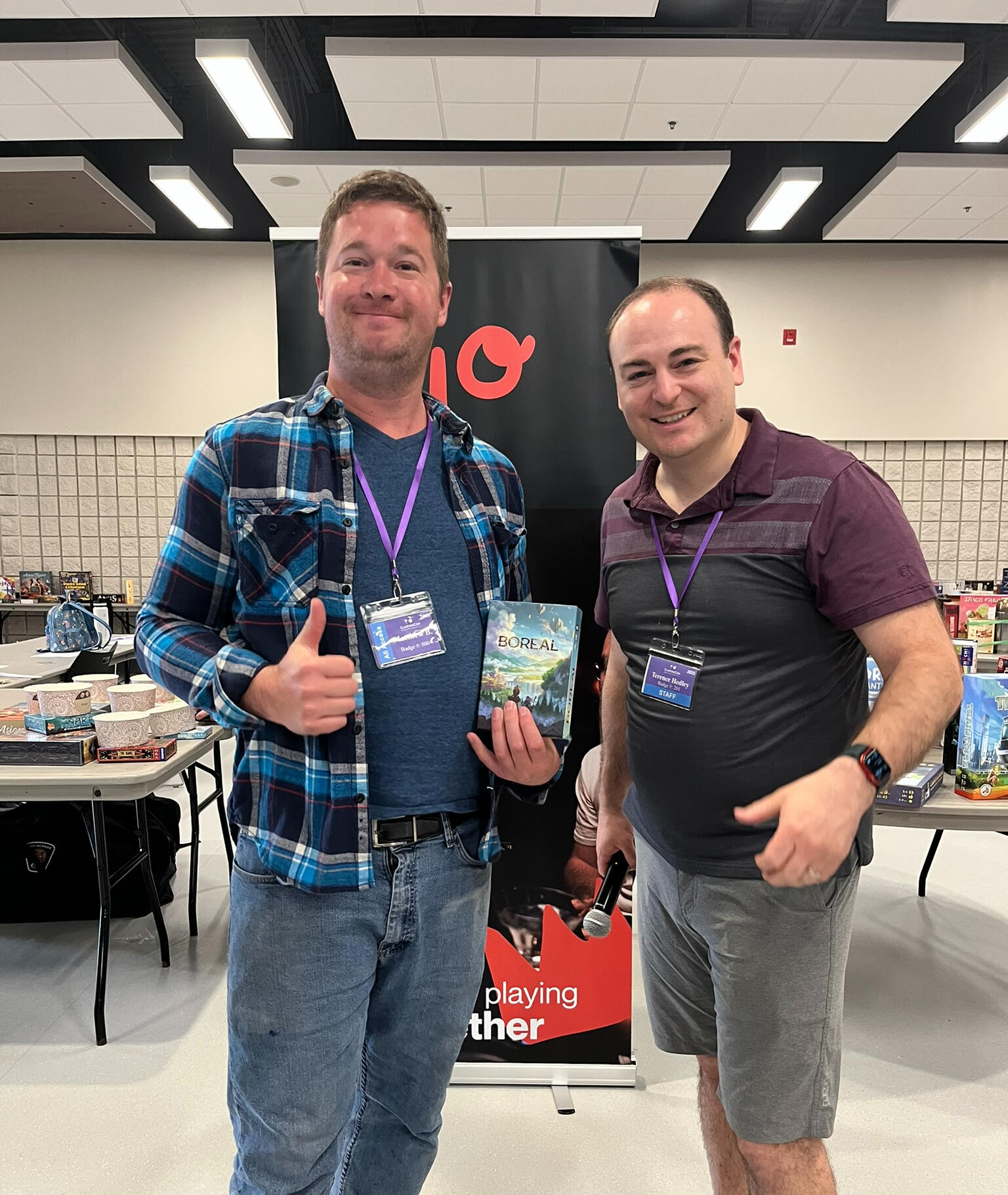 Cole Smith (Right), seen here with a ClarinCon attendee, is a board game designer from Ontario, Canada. He is the designer of Tanuki, a fast-paced card game where players compete to grow the most productive bamboo garden. Cole is also co-designer with Adrian Adamescu for their upcoming anticipated title, 3 Magi! Thank you Cole for joining us at ClaringCon 2025!