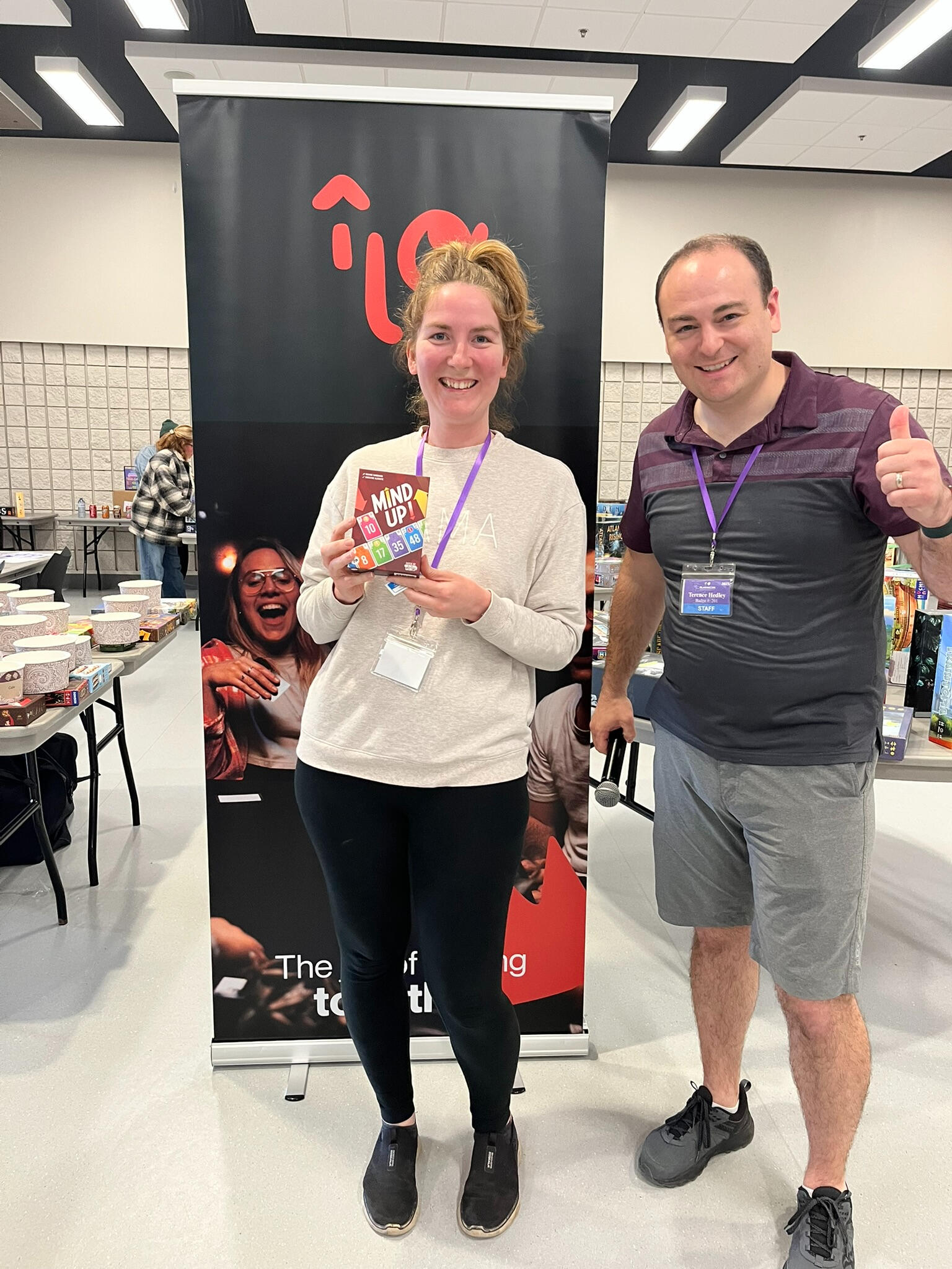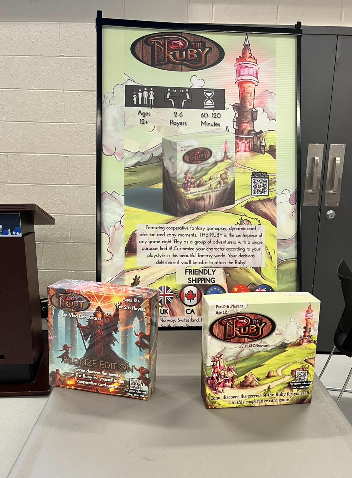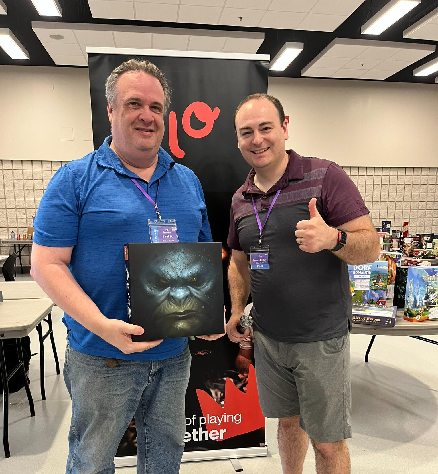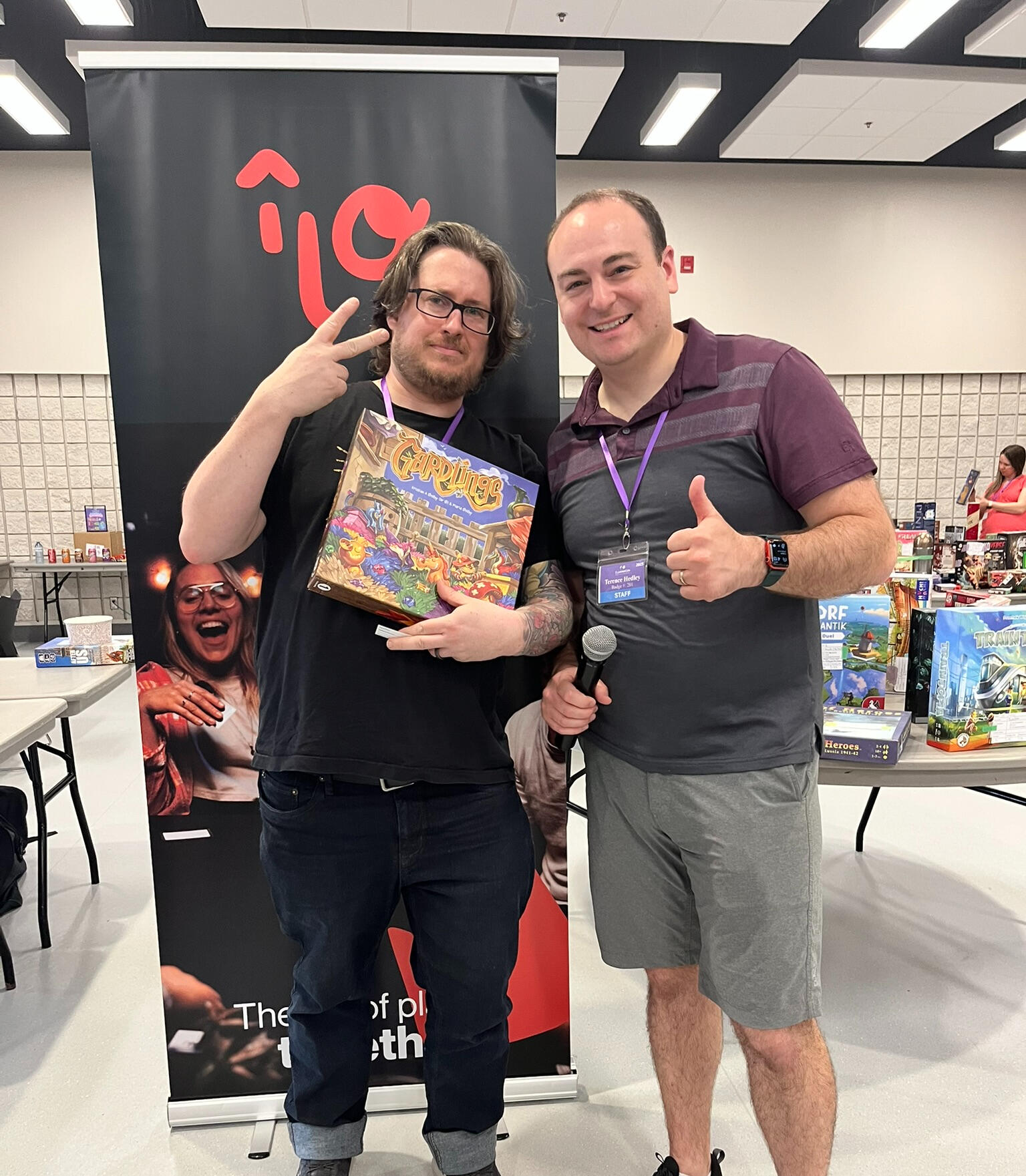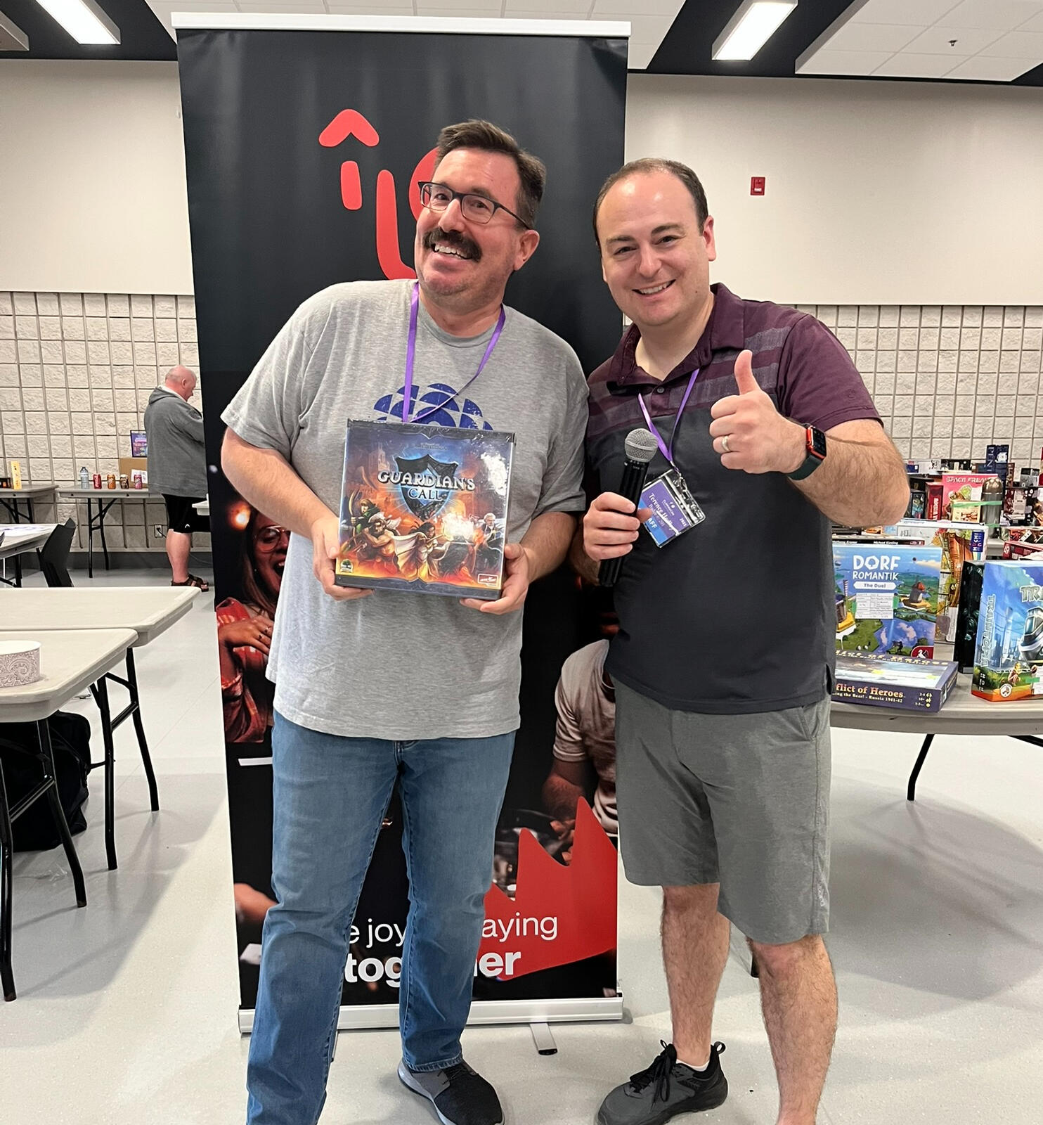 Adrian Adamescu (Right), seen here with a ClaringCon Attendee, is the Award Winning Game Designer of Sagrada, Mistwind, Sparks, 3 Magi, 7 Summits, Dice Theme Park, Gangster’s Dilemma, Speakeasy Blues and others. It was a pleasure to have Adrian join us at ClaringCon 2025!